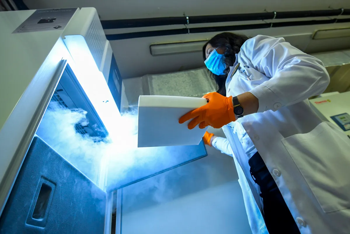 Bíró Krisztina szakgyógyszerész hűtőbe teszi a koronavírus elleni oltóanyagot, a Pfizer-BioNTech vakcináit a Debreceni Egyetem Klinikai Gyógyszertárában 2020. december 26-án