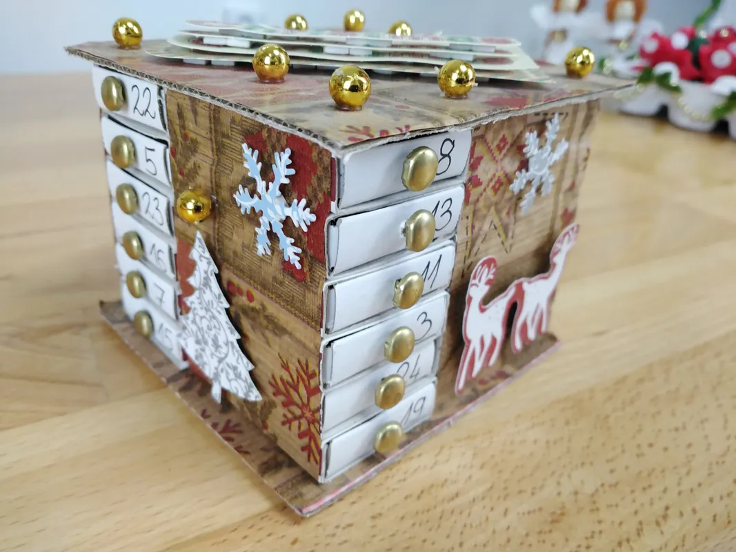 Ez a naptár 24 gyufásdobozból készült. A dobozokat hatosával egymásra teszi majd összeragasztja, alá és fölé keménypapírt ragaszt, majd az oldalait is bevonja.