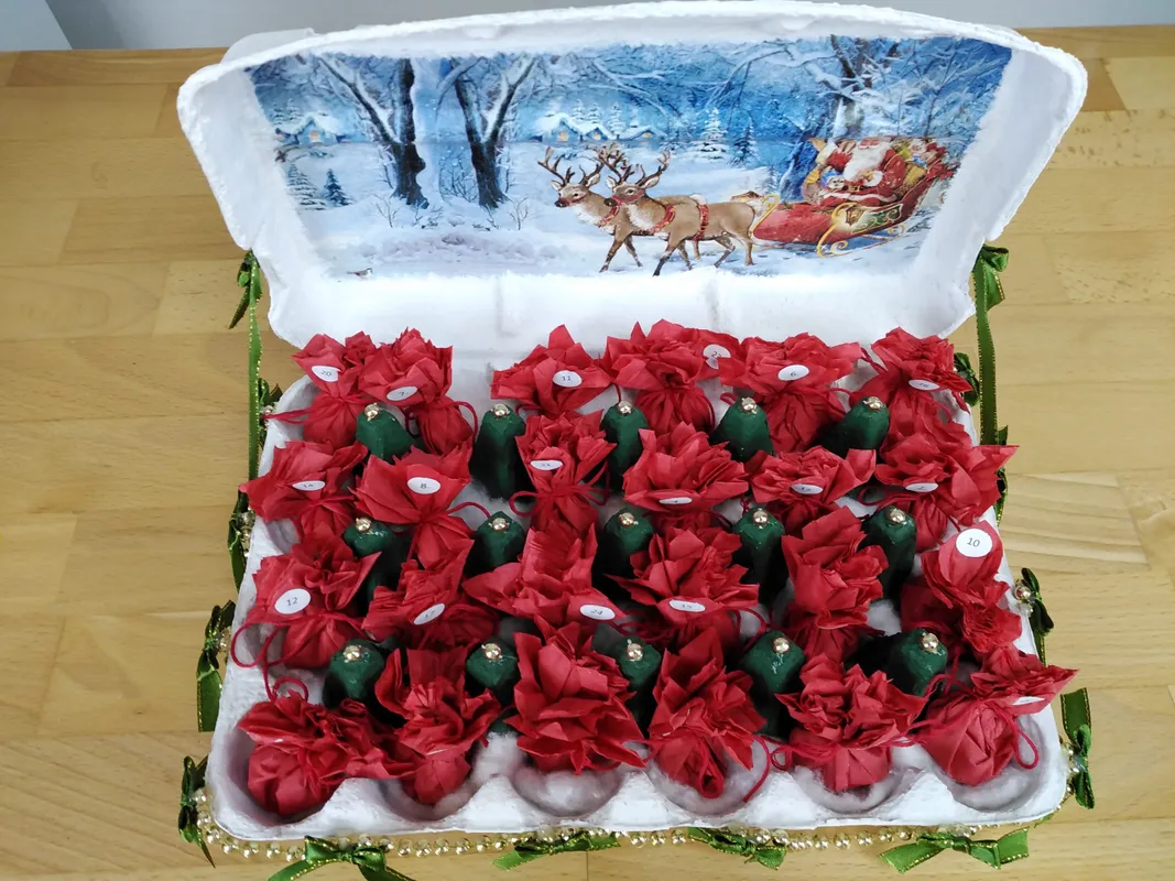 A 24 piros csomagot tartalmazó adventi kalendárium alapja két tojástartóból készült. A tartó alsó részének elválasztó kúpjait zöld festékkel színezte be, a csomagok piros szalvétából készültek, piros szalaggal átkötve. A tartó tetején a kép szalvétatechnikával készült. Tamara a dobozt vékonyan bekente ragasztóval, ráhelyezte a szalvétát, lesimította, majd azt követően a képet is lekente ragasztóval. A gyorsabb száradást hajszárítóval, hideg levegővel éri el.
