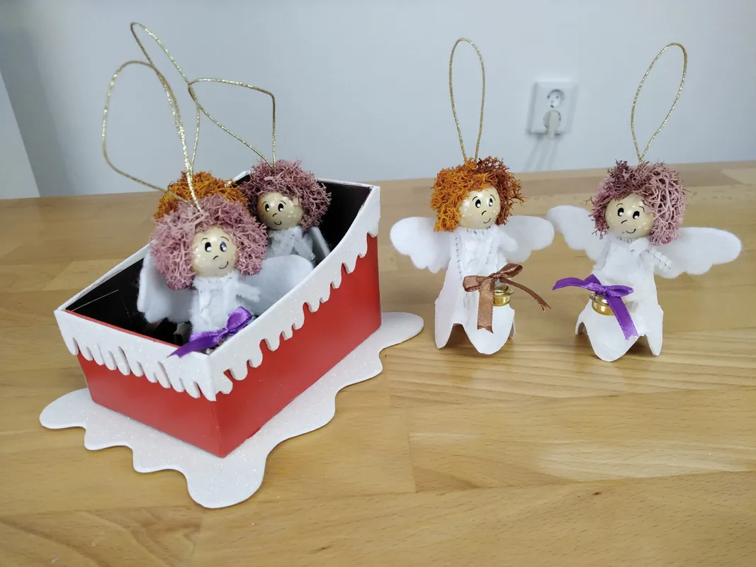 Tamara bonbonos dobozból hajtogatott szánkót a tojástartóból készített angyaloknak.