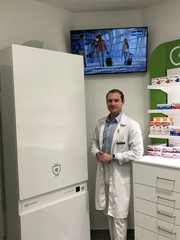„Ez egy briliáns eszköz. A légsterilizáló berendezés 90- 95 százalékban csírátlanítja, vírusmentesíti a levegőt, így a gyógyszertárban tartózkodók megtisztított, vírus-, baktérium- és gombamentes levegőt lélegeznek be” – magyarázza Krajcsovicz Pál. „Óránként négy-ötször szűri át a helyiségben a levegőt, ami gyakorlatilag egyszer is elég lenne. Eddig, ha a gyógyszertárba bejött egy Coronavírussal fertőzött beteg, akkor mindannyian azt a levegőt szívtuk be, amit ő kilélegzett, vagy köhögött.”
