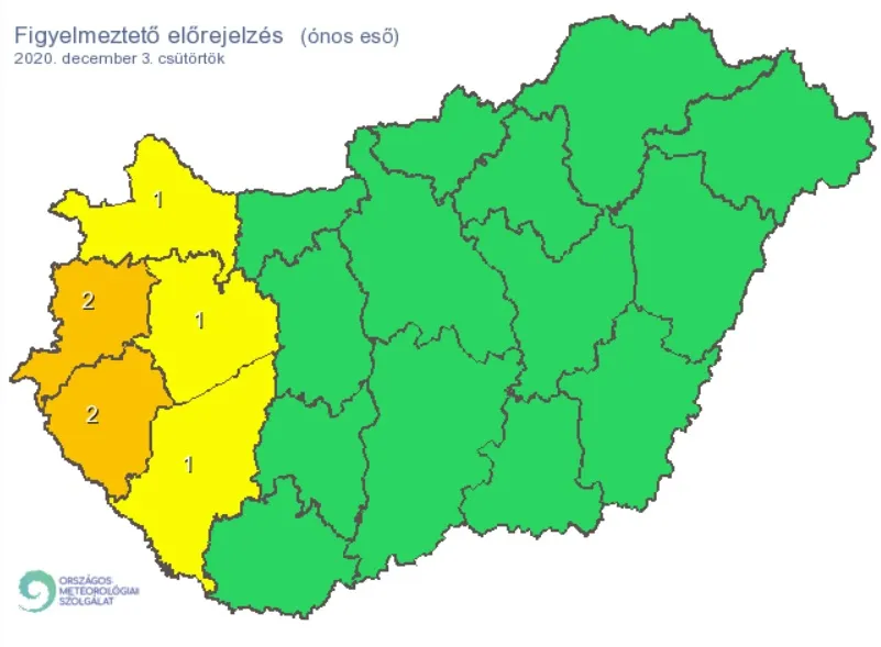 Öt megyét érintő riasztást adott ki az Országos Meteorológiai Szolgálat. Győr-Moson-Sopron, Somogy, Vas, Veszprém és Zala megyében várható ónos esőzés, havas eső.