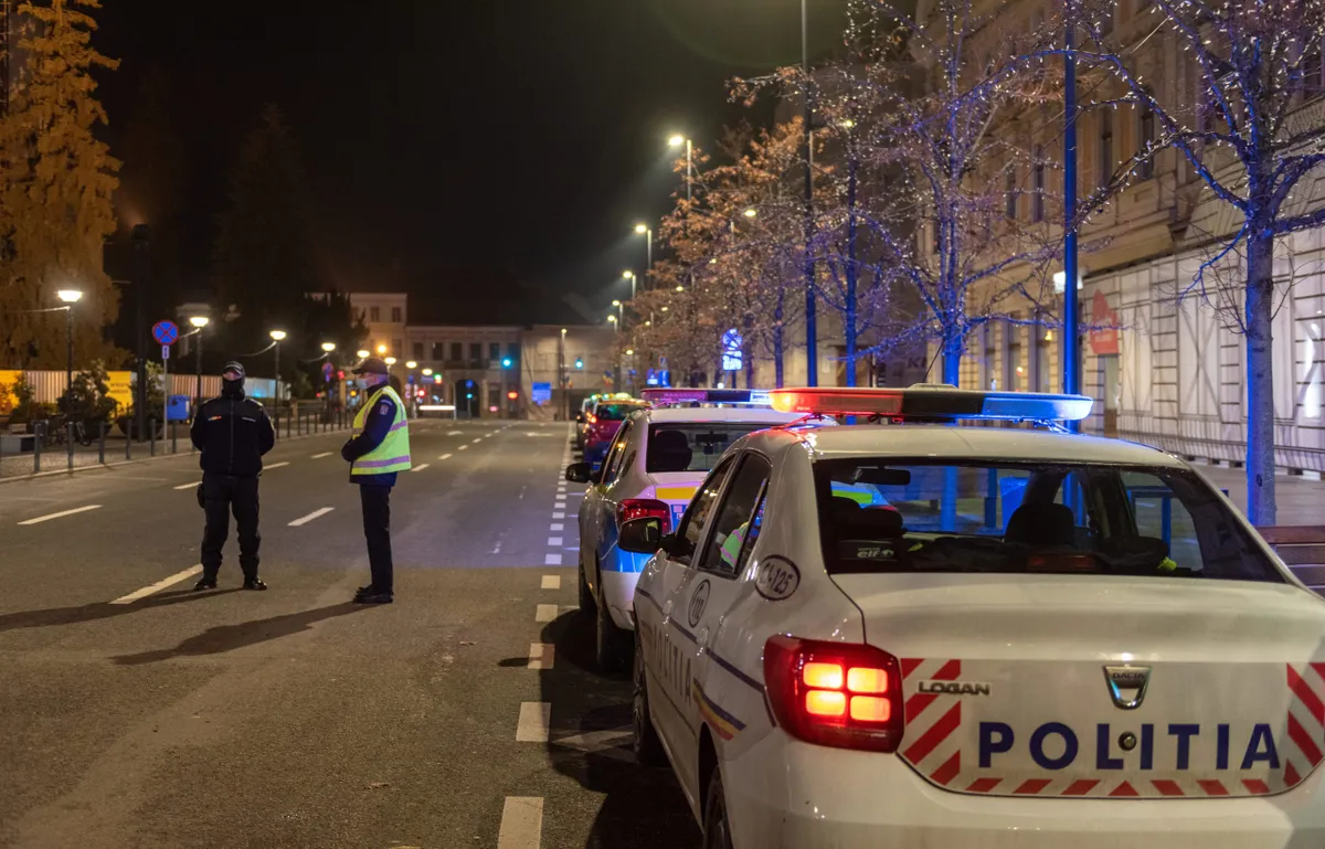 Rendőri ellenőrzőpont Kolozsvár központjában 2020. november 21-én éjjel. Romániában 23 és 5 óra között csak munkavégzés, halaszthatatlan, távkonzultációval meg nem oldható orvosi ellátás, gyógyszerbeszerzés, gyerek vagy idős, beteg személy gondozása és a családban történt haláleset miatt hagyhatják el lakóhelyüket az állampolgárok saját felelősségre kitöltött nyilatkozattal.