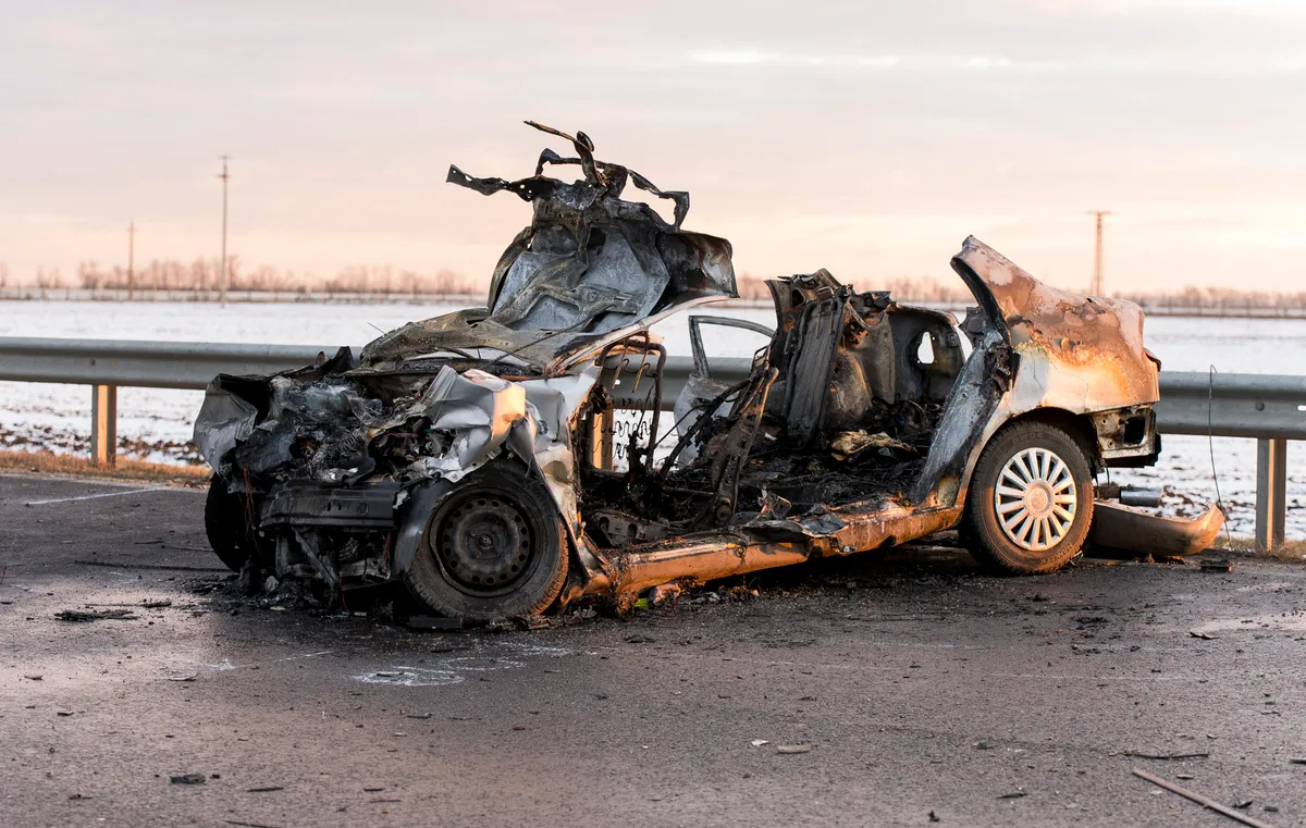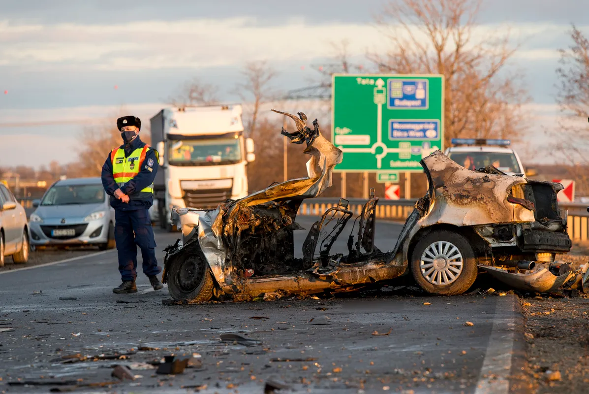 Összeroncsolódott, kiégett személygépkocsi, miután egy autószállító teherautóval ütközött a 813-as számú úton, Gyõr közelében 2021. január 14-én. A személyautóban utazó négy ember életét vesztette.