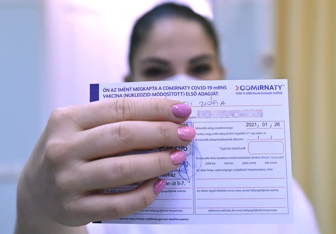 Nádasdi Zsófia gyógyszerész mutatja oltási lapját, miután megkapta a Pfizer-BioNTech vakcinából készült koronavírus elleni védõoltást a Szent László Kórházban 2021. január 5-én.