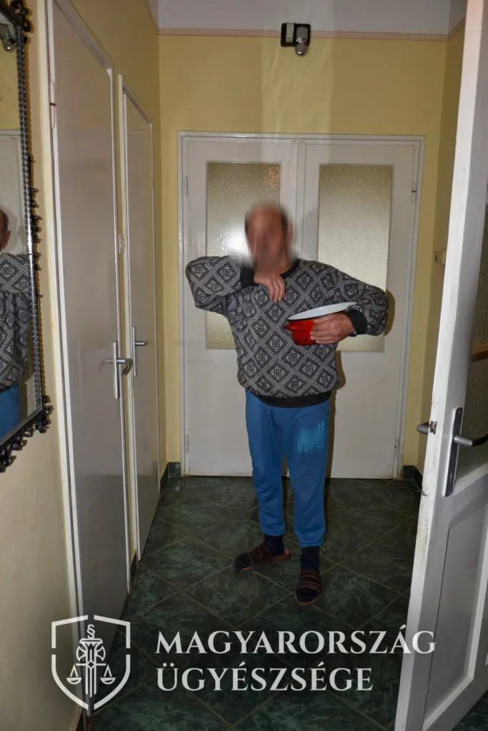 2019 tavaszán a férfi éktelen haragra gerjedt a felesége ellen, mert mire hazaért a horgászatból, nem húzta fel a redőnyt az otthonuk alsó szintjén lévő ablakokon. Ekkor egy poharat dobott a konyhában álló nő felé, aki az elől elhajolt. Ezt követően a férfi a konyhából – lábassal a kezében – az udvarra indult halat pucolni. Távozásakor a konyhaajtóban az útjában lévő feleségét olyan erővel meglökte könyökével, hogy a padlásajtónak esett. Az idős asszony onnan a földre csúszott, miközben combnyaktörést és kulcscsonttörést szenvedett.
