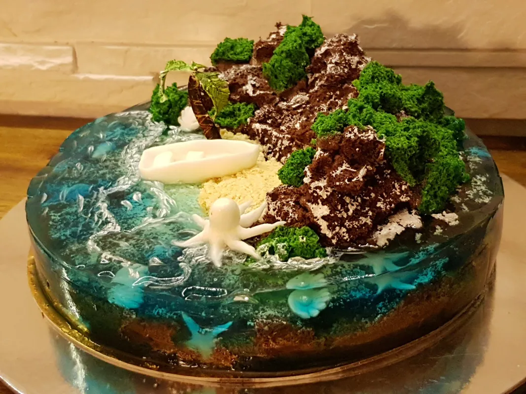 „Az alap csokoládétorta, a vizet három, különböző kék árnyalatú zselatin adja, a növényzet zöldre festett piskóta, a tengerpart kekszmorzsa, a tengeri lényeket fehér fondantból, a pálmafát cukorvirág alapanyagból készítettem. Amilyen nehéz volt felvágni, olyan hamar elfogyott” – árulja el nevetve.