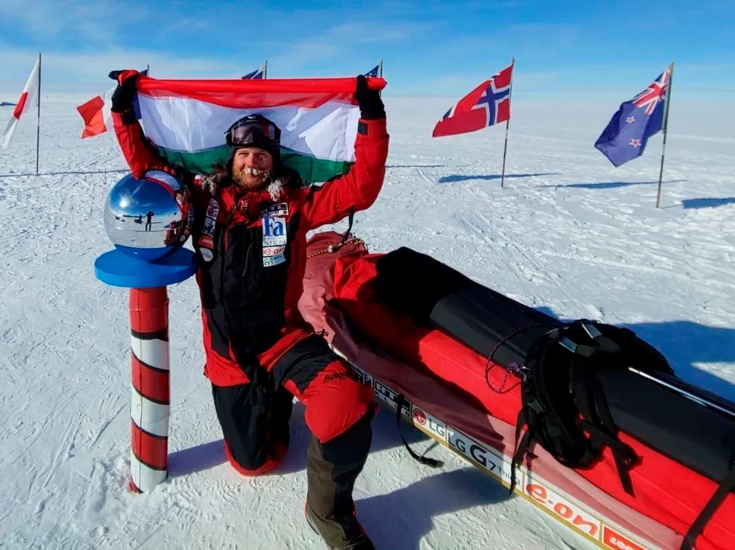 2019. január 7-én az Antarktiszon készült kép Rakonczay Gáborról, aki ezen a napon elsõ magyarként, a szárazföld, vagyis az Antarktisz partjáról indulva elérte a Déli-sarkot. Az extrém sportoló 44 nap és 4 óra alatt teljesítette a 917 kilométeres távot egy 94 kilós szánt húzva maga után.