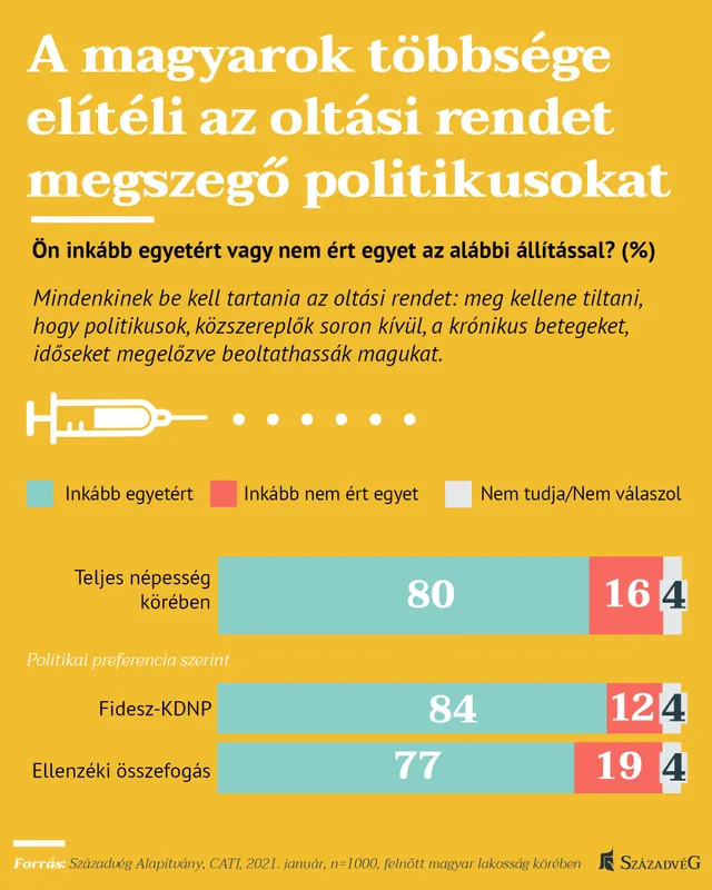 Az oltási terv megalkotásának indoka az volt, hogy a magyarok a veszélyeztetettség sorrendjében kerülhessenek beoltásra, biztosítva ezzel a rászoruló csoportok, az idősek és krónikus betegek elsőbbségét. Mivel a közéleti szereplők vállát – különösen járványhelyzetben – fokozott felelősség nyomja a példamutatás tekintetében, a Századvég megvizsgálta a magyar lakosság álláspontját az oltási rend betartásának fontosságáról.