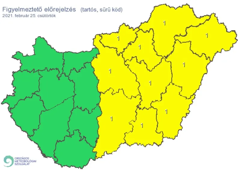 Pest, Bács-Kiskun, Békés, Borsod-Abaúj-Zemplén, Csongrád-Csanád, Hajdú-Bihar, Heves, Nógrád, Szabolcs-Szatmár-Bereg és Jász-Nagykun-Szolnok megyében is figyelmeztetést adtak ki a sűrű köd miatt.