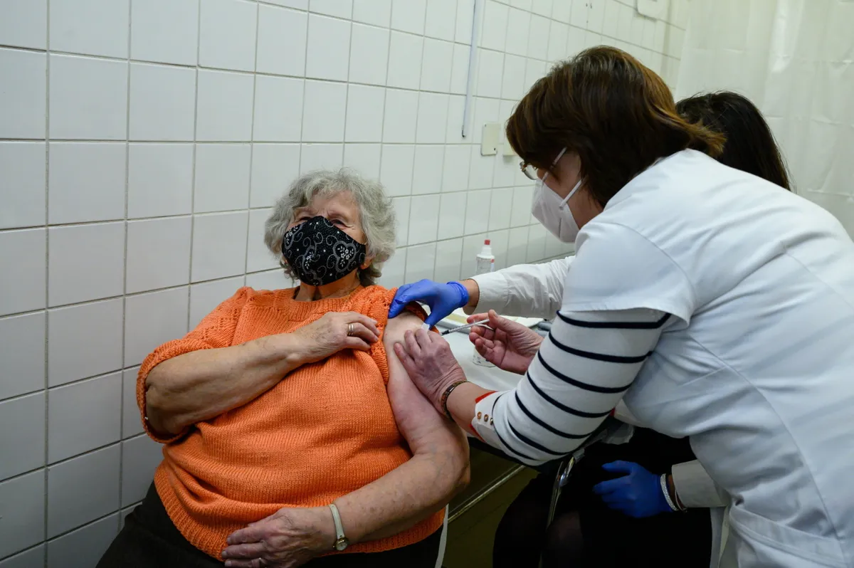 Atalai Zsuzsanna háziorvos beadja a Pfizer-BioNTech koronavírus elleni vakcinájából készített oltóanyagot egy idõs nõnek a Fejér Megyei Szent György Egyetemi Oktatókórház oltópontján 2021. február 7-én. A védõoltásra regisztrált legidõsebbek közül február 4. és 7. között minden háziorvosi praxisból hat idõs embert kórházi oltóponton oltanak be a Pfizer-BioNTech vakcinájából készült oltóanyaggal, 1080 háziorvos pedig maga is beolthat 10-10 regisztrált idõs embert az amerikai Moderna cég oltóanyagával.