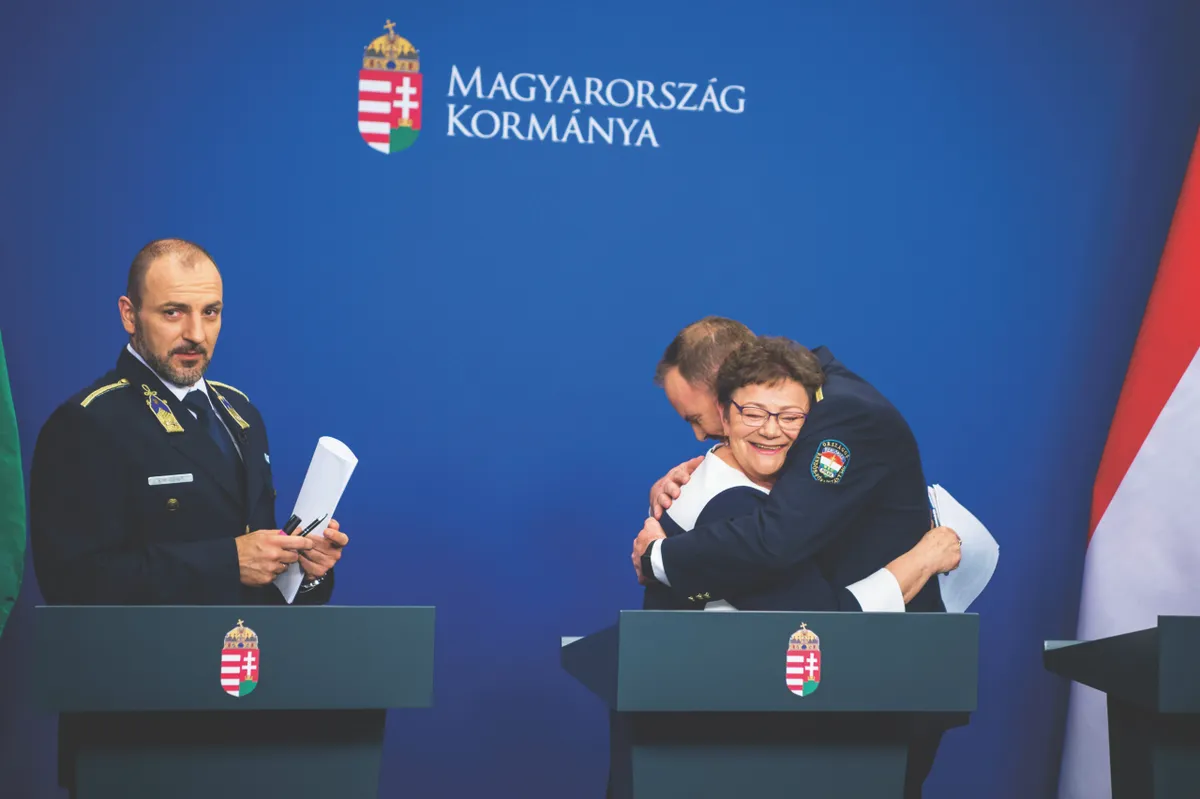 Müller Cecília országos tisztifőorvos és Gál Kristóf rendőr alezredes, az Országos Rendőr-főkapitányság (ORFK) szóvivője megöleli egymást,