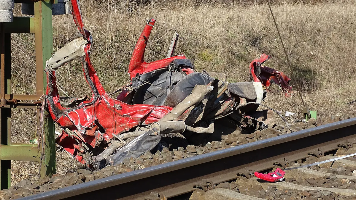 Vonattal ütközött személygépkocsi kettészakadt maradványai egy kecskeméti vasúti átkelõhelynél 2020. február 16-án. Az autó két utasa a helyszínen életét vesztette.