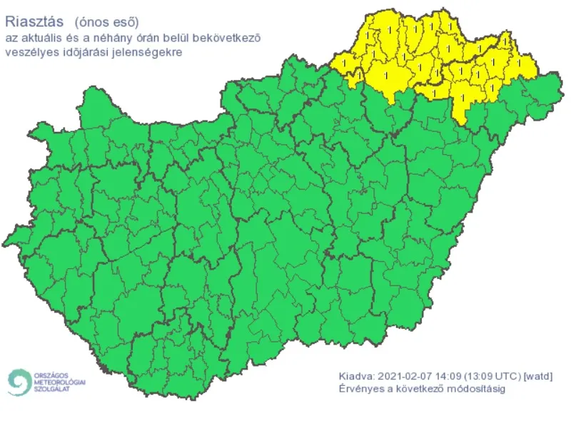 Az Országos Meteorológia Szolgálat adott ki elsőfokú riasztást az ország észak-keleti részére.