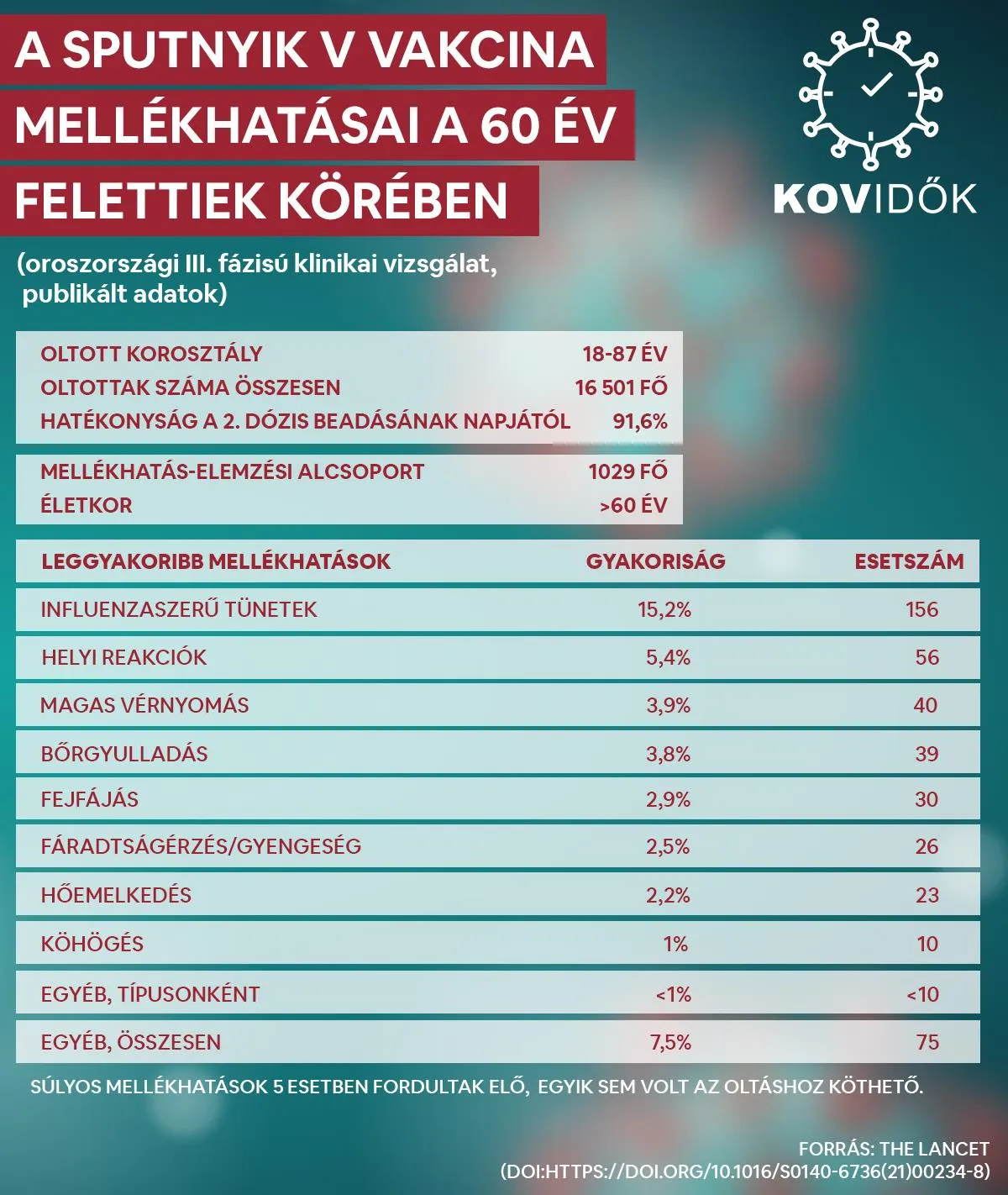 Az idős beoltottak 15,2%-ánál influenzaszerű tünetek jelentkeztek, 5,4%-uk tapasztalt duzzanatot az oltás helyén, 2,5%-uk pedig gyengeségről számolt be. Súlyos mellékhatások 5 esetben fordultak elő, de egyik sem volt az oltáshoz köthető – olvasható a KOVIDők Facebook-oldalon.