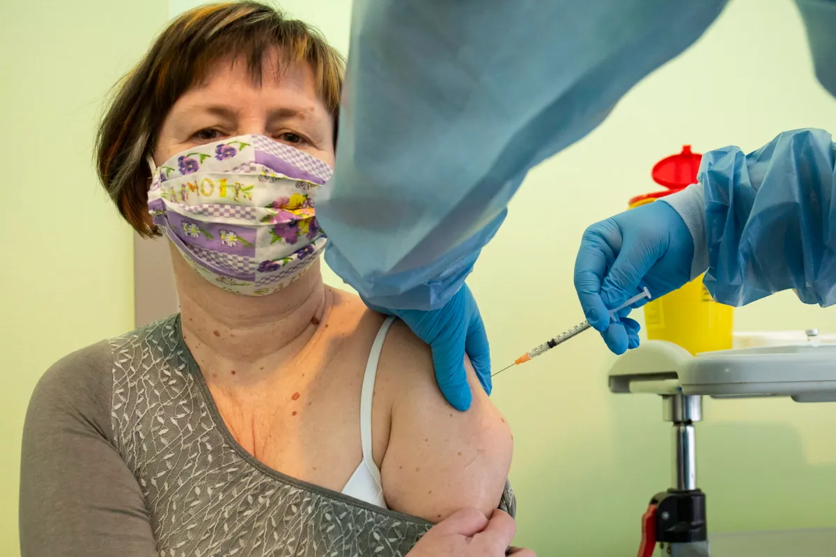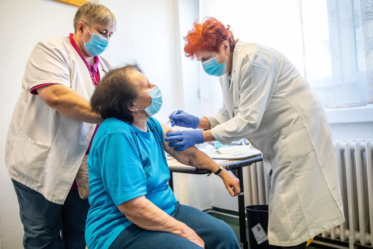 Hóbor Ágnes orvos beadja a Pfizer-BioNTech koronavírus elleni vakcináját egy idõs nõnek a veszprémi Csolnoky Ferenc Kórház oltópontján 2021. március 6-án.