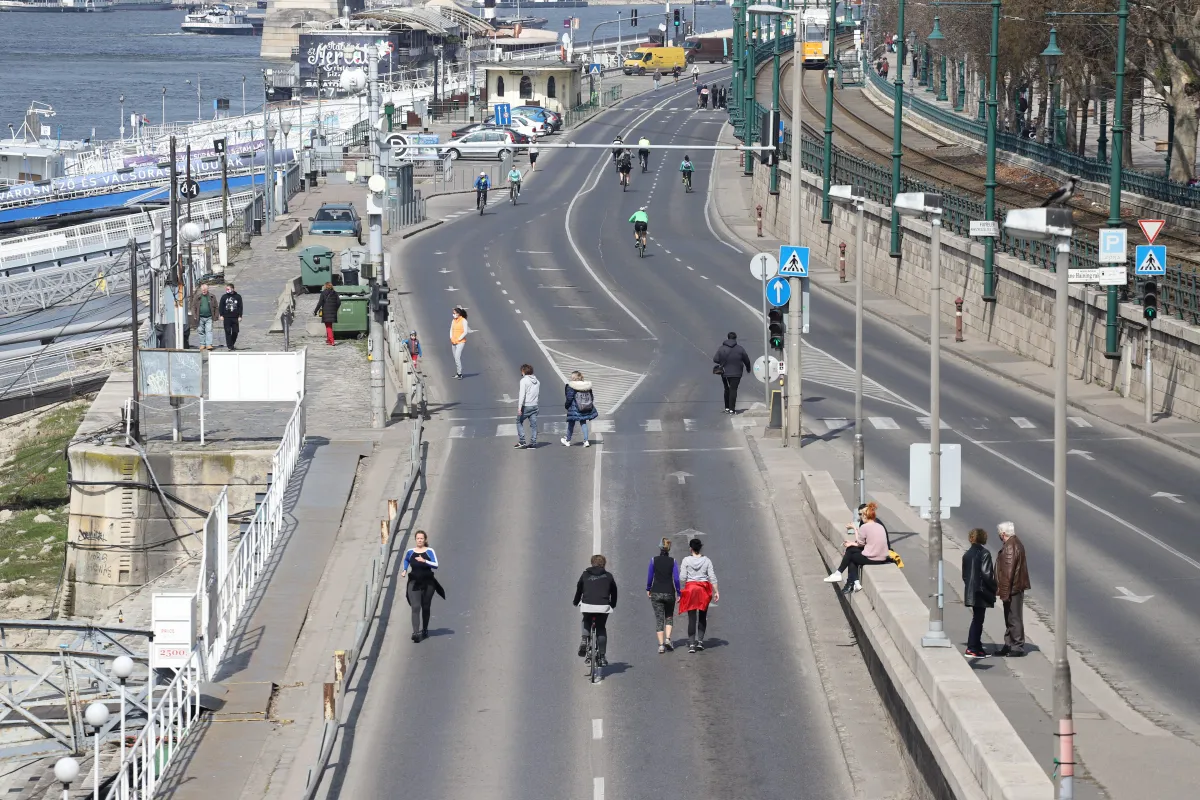 A fotókon is jól látható, hogy a gyalogosok örömmel használják ki a lehetőséget és sétálgatnak a rakparton. Nem véletlen, hiszen így több a gyalogosan bejárható szabad tér Budapesten – és egyben kevesebb az esély arra, hogy sokan legyenek egy helyen.