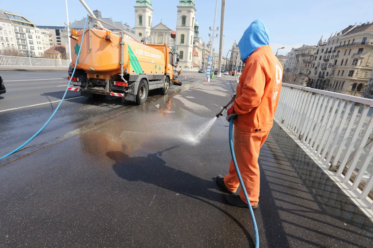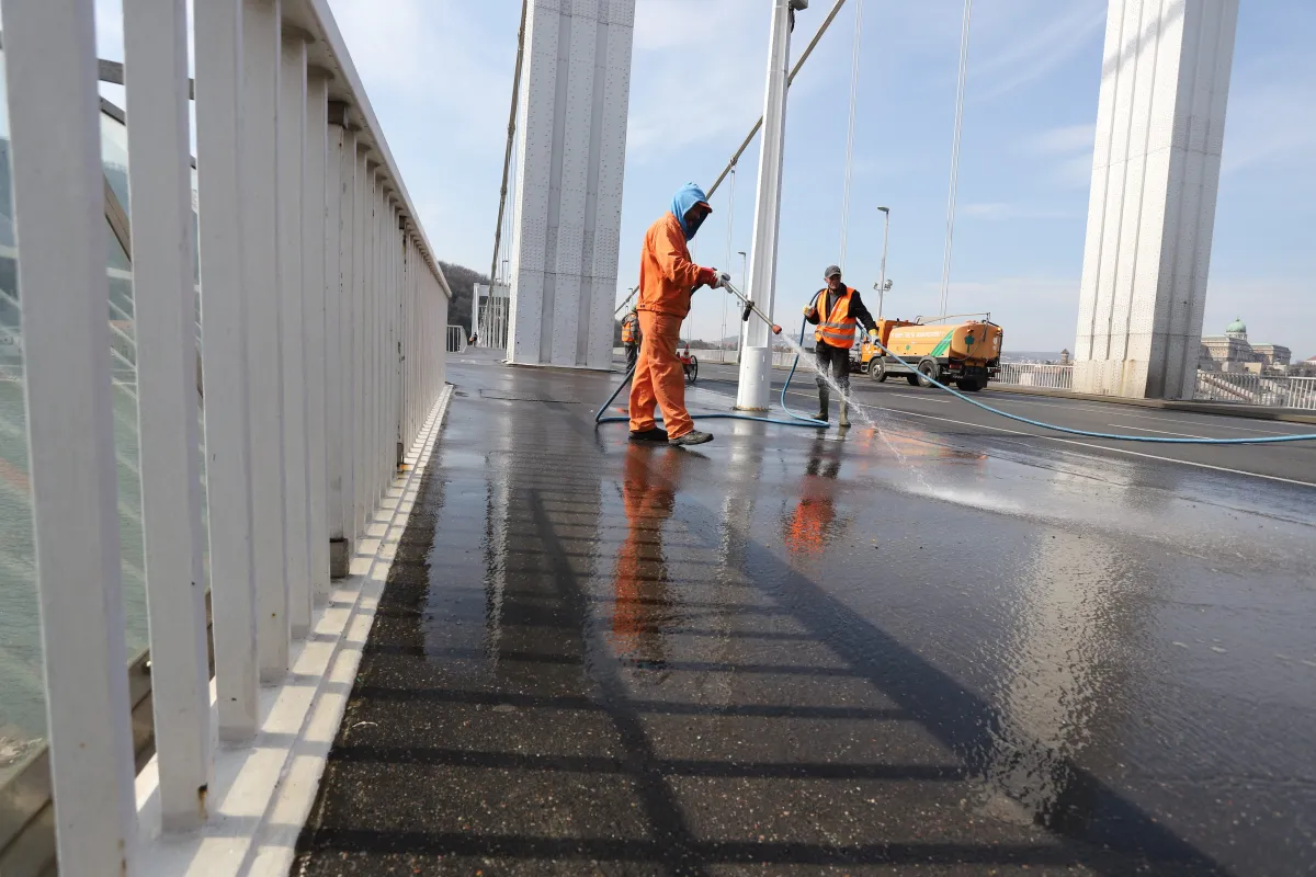 Szombaton ez fél 7-től tartott délután fél kettőig az Erzsébet híd Pestre vezető oldalán, vasárnap ugyanekkor a híd Budára vezető oldalát mossák majd.