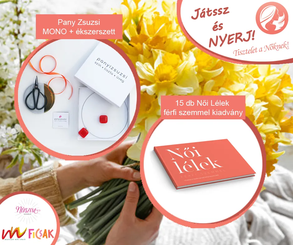 Szeretnék nőnapi játékkal is a nők tiszteletére, védelmére és a női önbecsülésre irányítani a figyelmet. Idén egy csodaszép Panyi Zsuzsi MONO ékszerszettet és 15 db Női lélek Férfi szemmel kiadványt sorsolnak majd ki. A játék a Fiatal Családosok Klubja, valamint a Mindennapok Női Szemmel Egyesület Facebook oldalán érhető el.