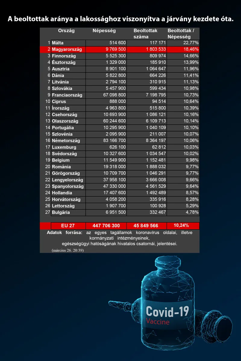 Magabiztosan, fegyelmezetten tartja az oltási ütemet Magyarország, így továbbra is lakosságarányosan a második helyen szerepel az uniós országok listáján. A tegnapi adatok alapján Belgium, Spanyolország és Hollandia is a legrosszabbul teljesítő uniós országok között van.