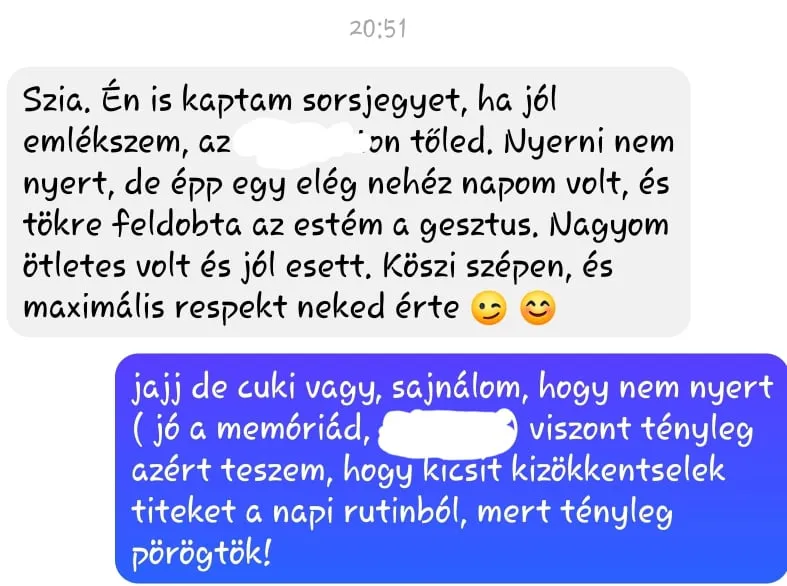 Amióta a lány belekezdett a sorsjegyosztásba, folyamatosan kap szívmelengető üzeneteket. Sokaknak a kedves szó és a gesztus is elég, hogy feldobja a napjukat. Melitta szerint túlságosan elszemélytelenedtek az utóbbi időben az emberek.