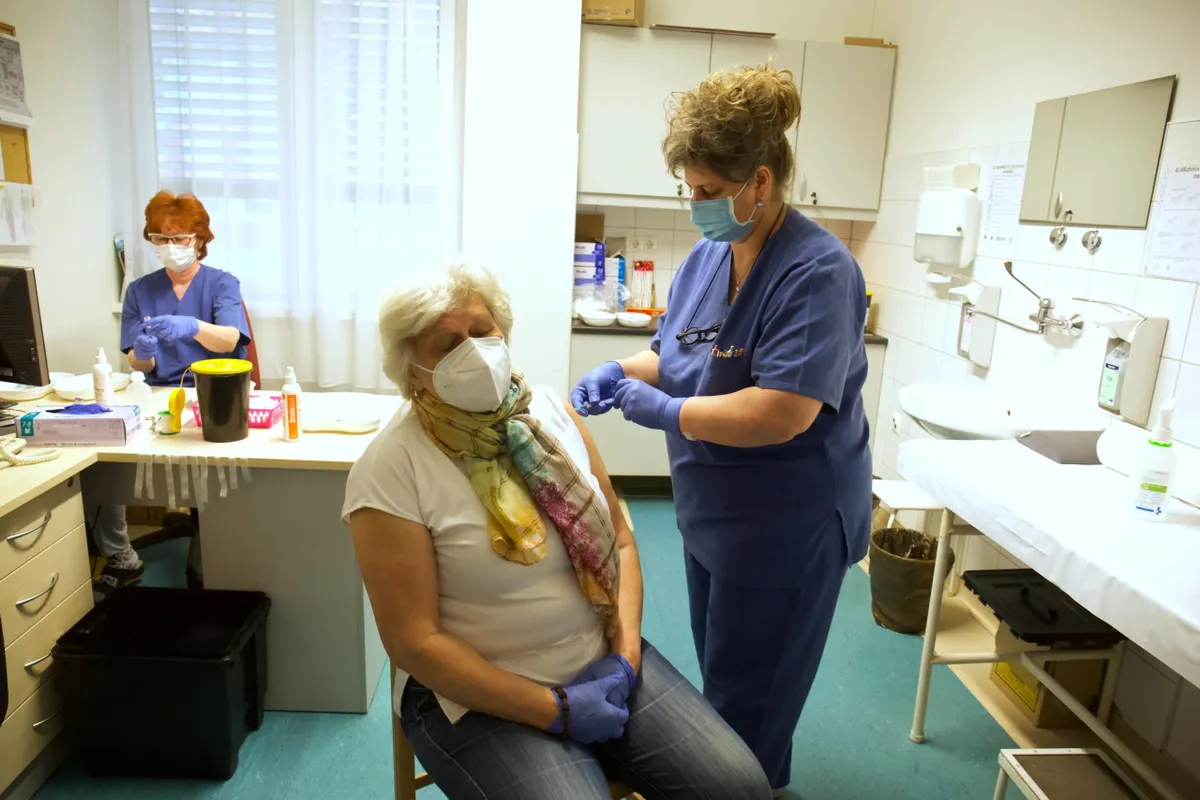 Sperl Rózsa Enikõ ápolónõ beadja a Pfizer-BioNTech koronavírus elleni vakcina elsõ adagját egy idõs nõnek a Somogy Megyei Kaposi Mór Oktató Kórház oltópontján 2021. március 28-án.