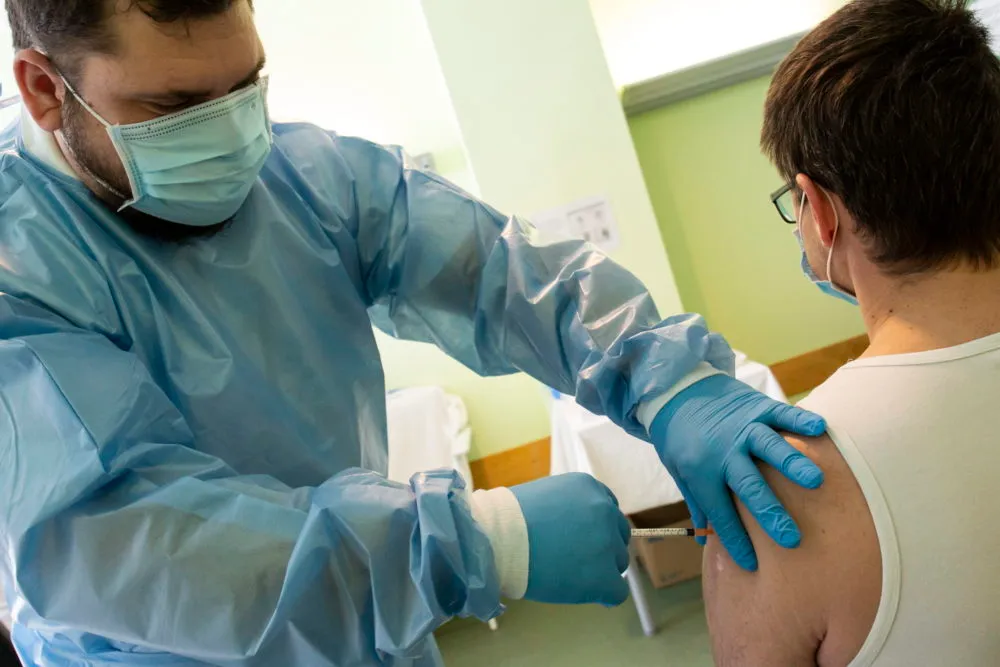 Anfer Kristóf ápoló beadja a Pfizer-BioNTech koronavírus elleni vakcináját egy páciensnek a Zala Megyei Szent Rafael Kórházban 2021. március 6-án.