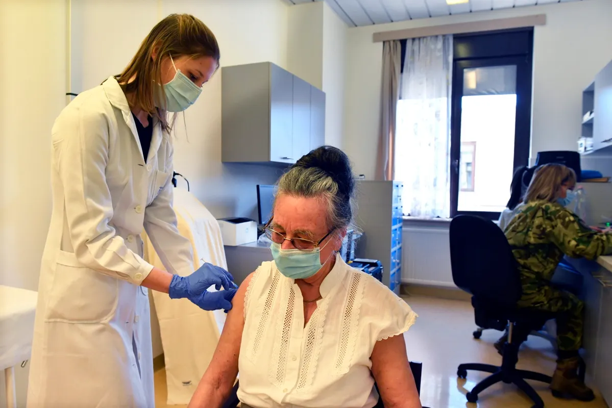 Hóbor Ágnes orvos beadja a Pfizer-BioNTech koronavírus elleni vakcináját egy idõs nõnek a veszprémi Csolnoky Ferenc Kórház oltópontján 2021. március 6-án.