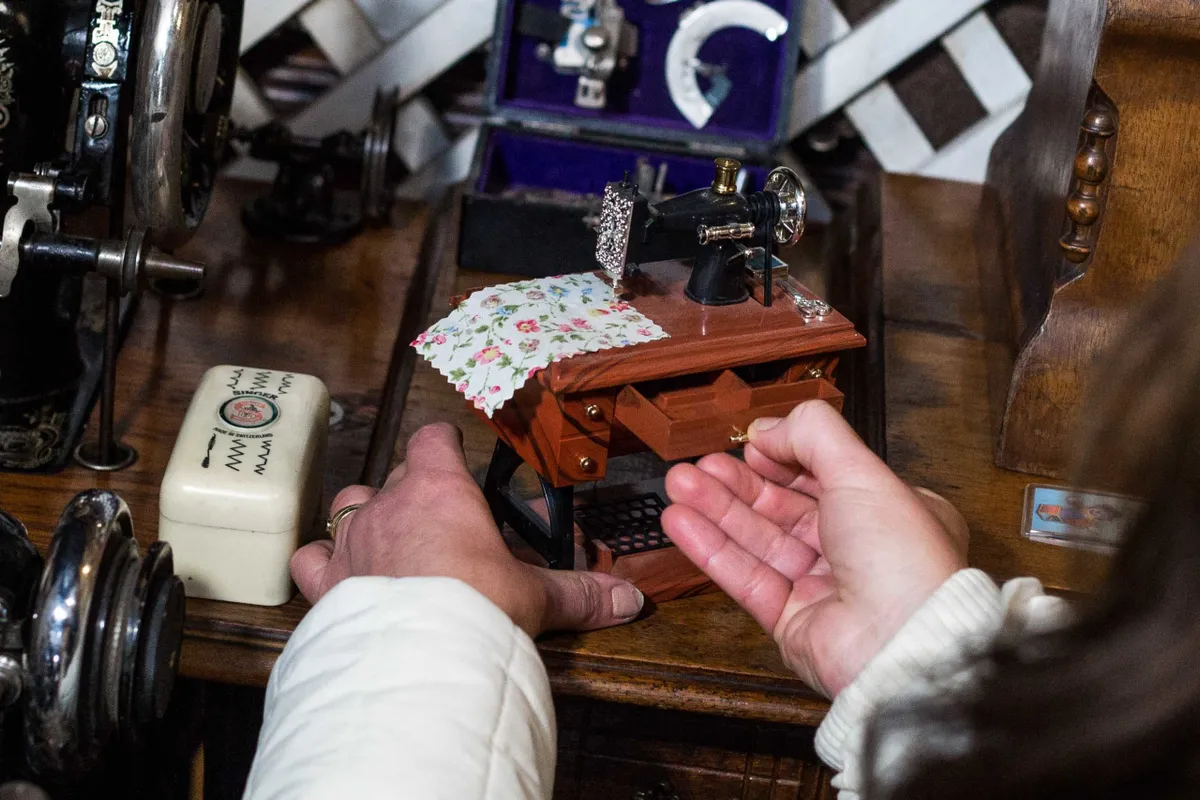 Az egykezes japán kézi sorvarrótól a világhírű Singereken át az első magyar gyártású varrógépig minden van itt, és méghozzá kipróbálhatóan működik is. A Singerekhez kicsi dobozban gyári tartozékok az egyik asztalon.