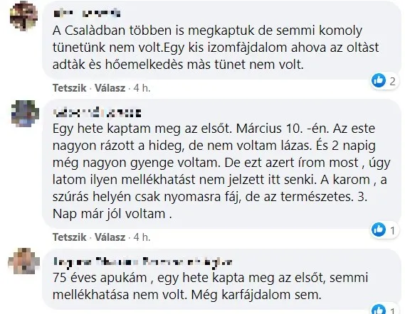 „Én már megkaptam mindkettő adagot. Karfájdalom, fejfájás és fáradság volt 2 napig mindkettőnél„ – írta egy kommentelő.