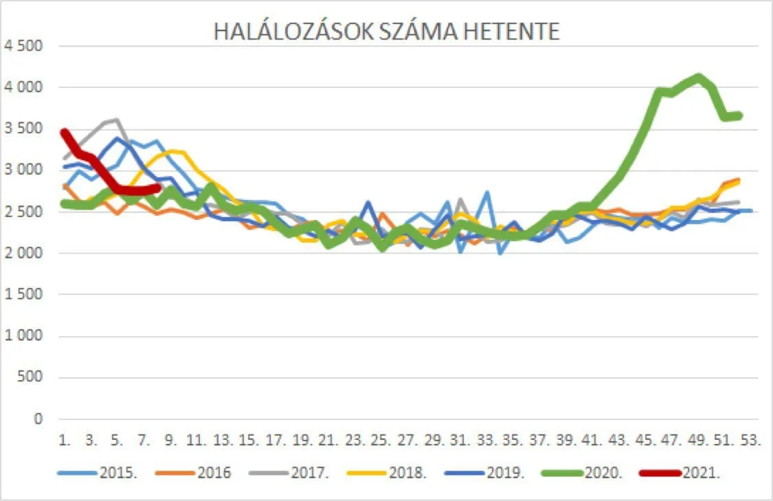 A heti halálesetek száma 2015 óta a 2500-3000-es tartomány között mozog, ezek az átlagos halálozási adatok.