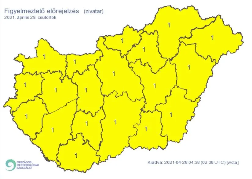 Az Országos Meteorológiai Szolgálat csütörtökre a teljes országra elsőfokú riasztást adott ki.