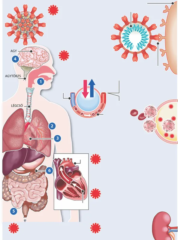 Kezdetben a szakemberek is azt hitték, csupán egy légúti vírussal állunk szemben, ám azóta bebizonyosodott, hogy az egész szervezetet, valamennyi szervet megbetegítheti a fertőzés, testszerte okoz gyulladásokat és létfontosságú szervek kerülhetnek veszélybe a Covid miatt. A szakemberek szerint azért, mert a tüskéi segítségével könnyedén kapcsolódik a szervezetünkben található úgynevezett ACE2 receptorhoz, így jut be a sejtekbe. Ezek a receptorok pedig szinte az összes szervünkben megtalálhatóak. A Ripost7 öszeállítása.