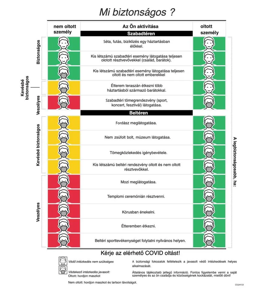 Az ábrából egyértelműen kiderül, hogy az oltott személyek nagyobb biztonságban vannak, mint az oltatlanok, de vannak olyan helyek, ahol számukra is ajánlott a maszk használata.