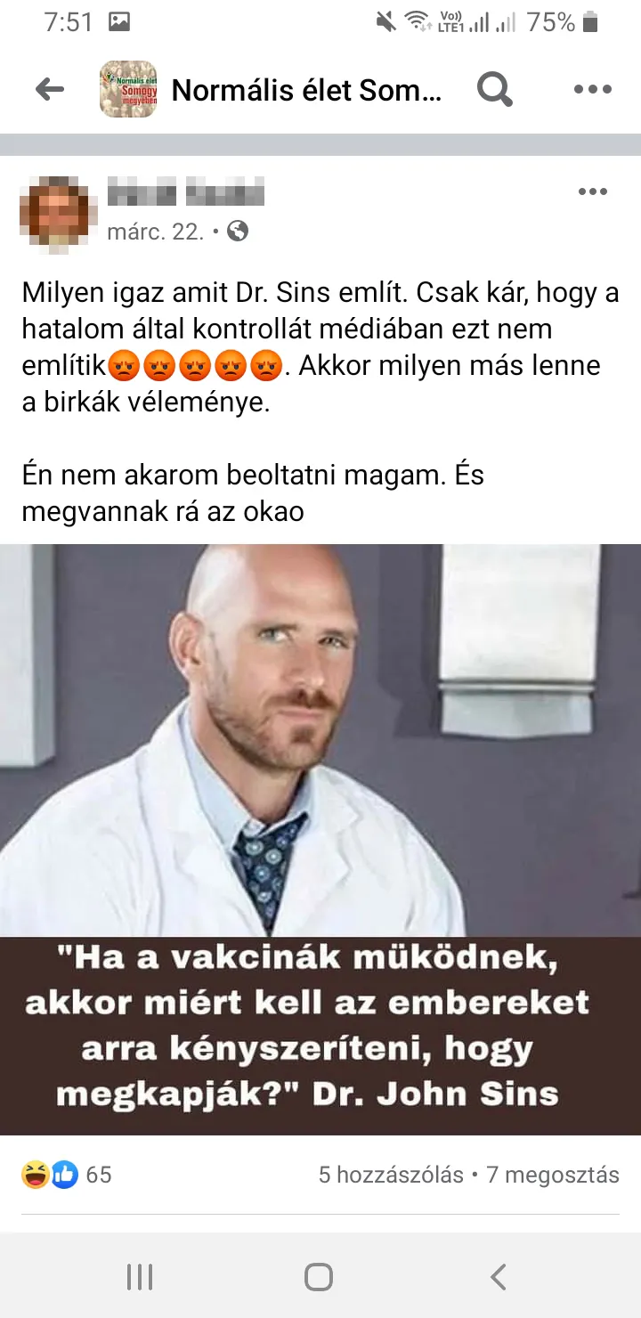 Most pedig úgy tűnik, hogy még saját magukat is sikerült alulmúlniuk: egy Somogy megyei csoportjukban a napokban indult útjára legfrissebb oltás-ellenes fotó, melyen egy bizonyos dr. John Sins látható, és „tőle” egy gondolat, miszerint „Ha a vakcinák működnek, akkor miért kell az embereket arra kényszeríteni, hogy megkapják?”. Bár már önmagában az is gyanús lehet, hogy egy orvos ilyen, minden szakmai alapot nélkülöző gondolatot megfogalmaz, ám mégsem ez a legmegdöbbentőbb a posztban.