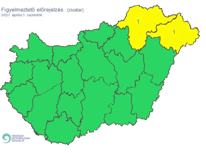 Az Országos Meteorológiai Szolgálat figyelmeztető előrejelzése szerint, csütörtökön a délutáni órákban az északkeleti megyékben (elsősorban Borsod és Szabolcs) a záporok mellett zivatar is kialakulhat, a zivatarok környezetében viharos (60 km/h-t meghaladó) széllökés és kis méretű jégeső is előfordulhat.