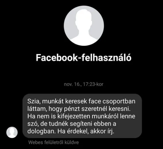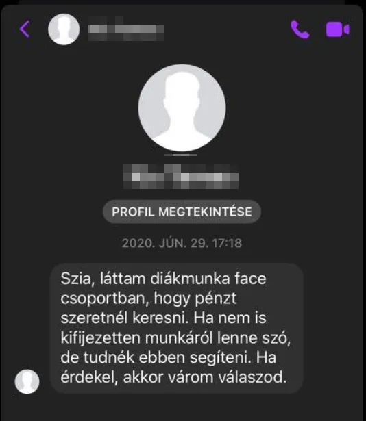 „Szia! Bocsi, hogy írok, de láttam a diákmunka csoportban, hogy pénzre van szükséged. Ebben tudnék segíteni, bár nem kifejezetten munkáról lenne szó. (...) Intim jellegű, ha érdekel” – írta a K. Tamás néven regisztrált, álprofilt alkamazó zaklató a lánynak.