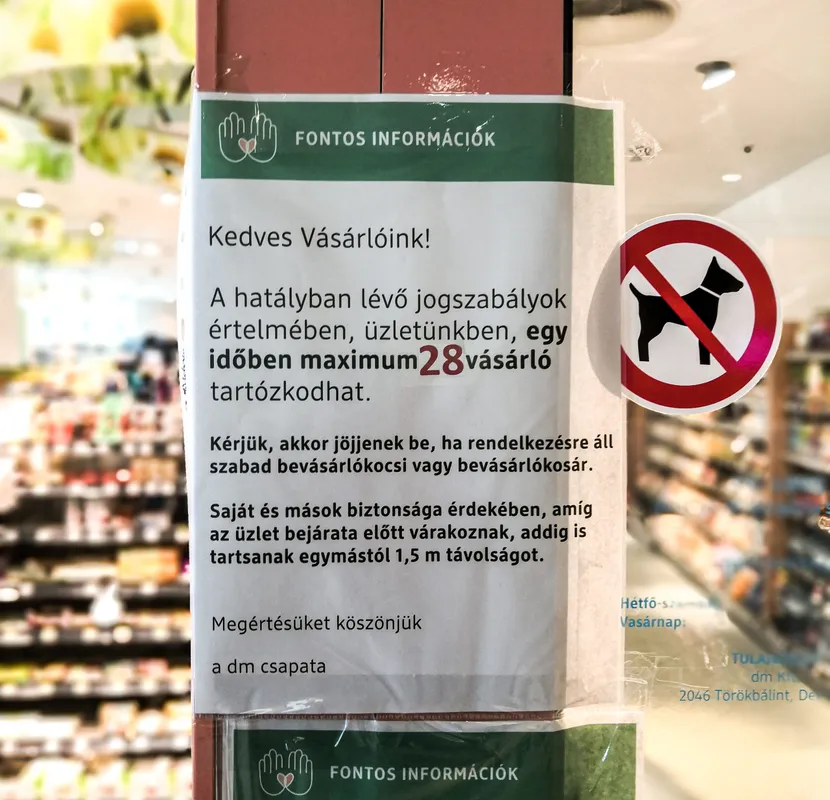 Ennek értelmében az üzletekben négyzetméter alapon maximalizálva van a vevők száma, ezért a boltok bejáratához, kirakatába új táblák kerültek ki.
