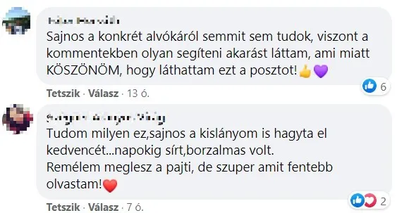 „Ha nem találják meg, nekünk van egy ugyanilyen, szívesen oda adom” – érkezett az első komment, majd hamarosan még egy ugyanilyen felajánlás érkezett, így már biztos, hogy a kisfiúnak nem kell tovább szomorkodnia. Ráadásul több ember napját is feldobták az önzetlen, segítő szándékú kommentek, és megköszönték, hogy vannak még ilyen emberek.