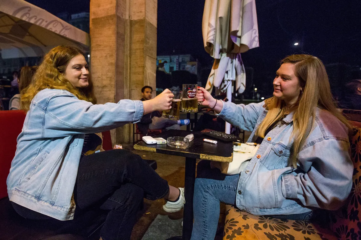 „Mi hárman vagyunk testvérek, és mindannyian megkaptuk már az oltást” – mesélte Dóri és a tesója Anna, akik annak ellenére, hogy mehettek volna bentre is, mégis kint koccintottak a teraszon. „Bent nincs olyan hangulat, és kevesen vannak, meg kint tudunk cigizni. Ezek miatt még szóba se jött, hogy beüljünk.”
