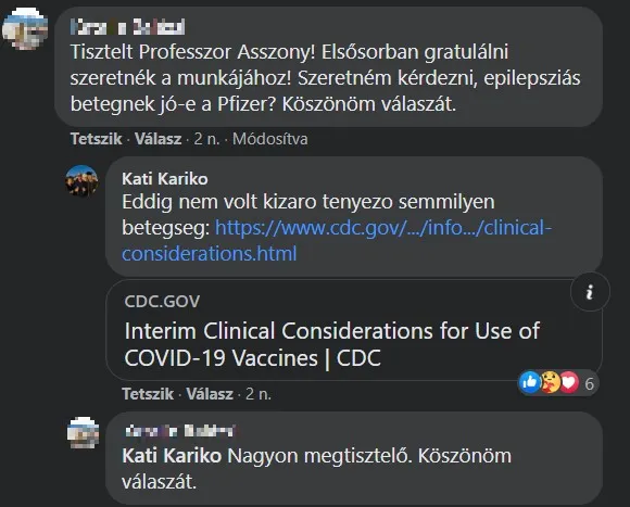 Magyarországon mintegy 150 ezer epilepsziás beteg él, akiket ugyanúgy fenyeget a világjárvány, mint egészséges embertársaikat: de vajon adható-e nekik is Pfizer-vakcina vagy sem? Erről kérdezte az egyik hozzászóló közösségi oldalán Karikó Katalint, a védőoltás kifejlesztésében kulcsszerepet játszó magyar biokémikust.