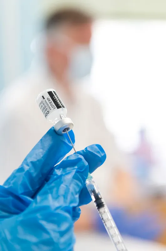 Az asszisztens oltáshoz készíti elő a német-amerikai fejlesztésű Pfizer-BioNTech koronavírus elleni oltóanyagot.
