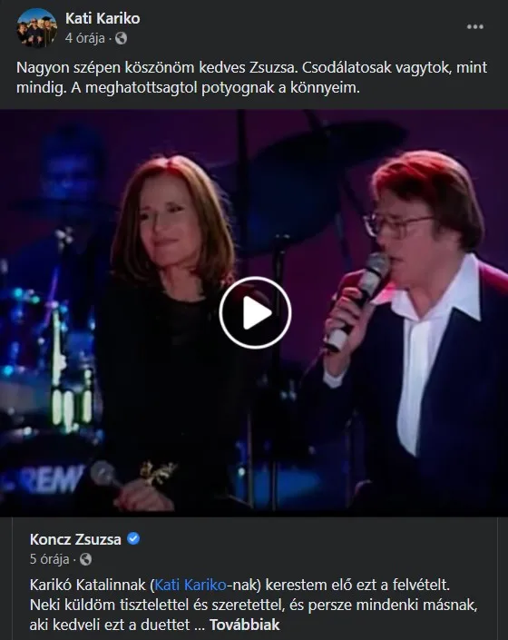 „Karikó Katalinnak kerestem elő ezt a felvételt. Neki küldöm tisztelettel és szeretettel, és persze mindenki másnak, aki kedveli ezt a duettet Zoránnal.” – írta friss bejegyzésében hivatalos Facebook-oldalán Koncz Zsuzsa.