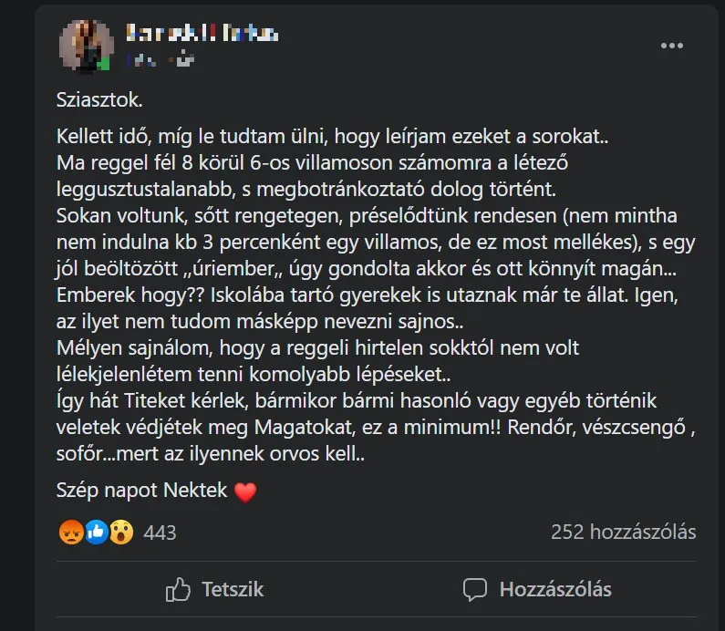 A budapesti utas azután kelt ki magából a Facebookon, hogy kellemetlen képsoroknak volt szemtanúja a 4-es 6-os villamos vonalán.