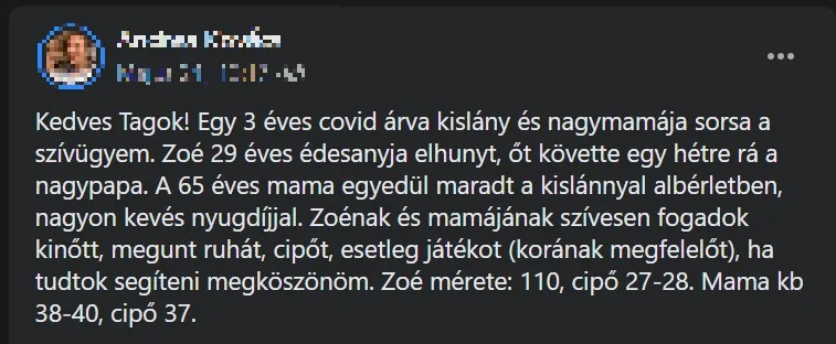 „Zoénak és mamájának szívesen fogadok kinőtt, megunt ruhát, cipőt, esetleg játékot (korának megfelelőt), ha tudtok segíteni megköszönöm.”