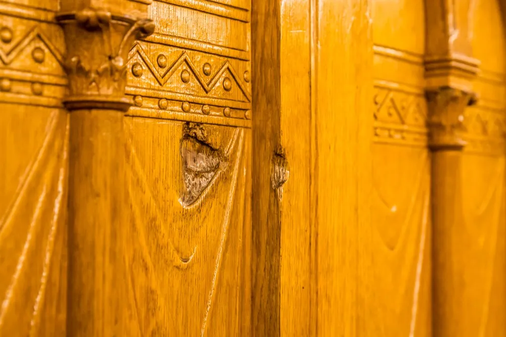 A szónoki emelvény fa burkolatában egy lyukra lehetünk figyelmesek – nem véletlenül nem javították meg, egy történelmi esemény emlékét idézi.