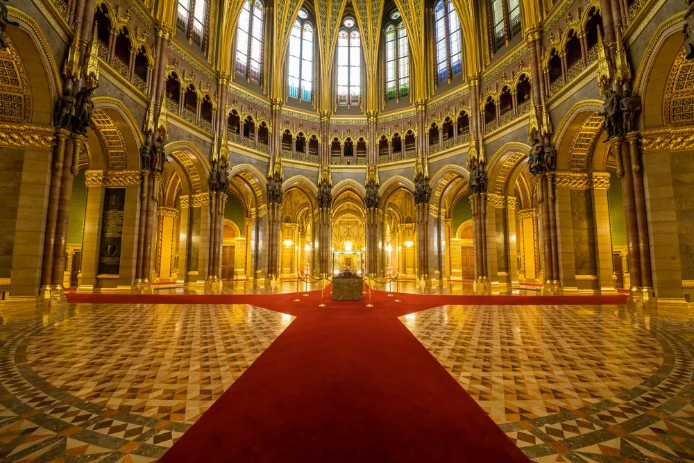 A Ház mértani középpontja a kupolacsarnok közepén található. Magyarország szimbolikus középpontjában őrzik a Szent Koronát és a koronázási jelvényeket 2000 január elseje óta. A honvéd koronaőrök a nap 24 órájában vigyáznak rá, fényképezni sem szabad.