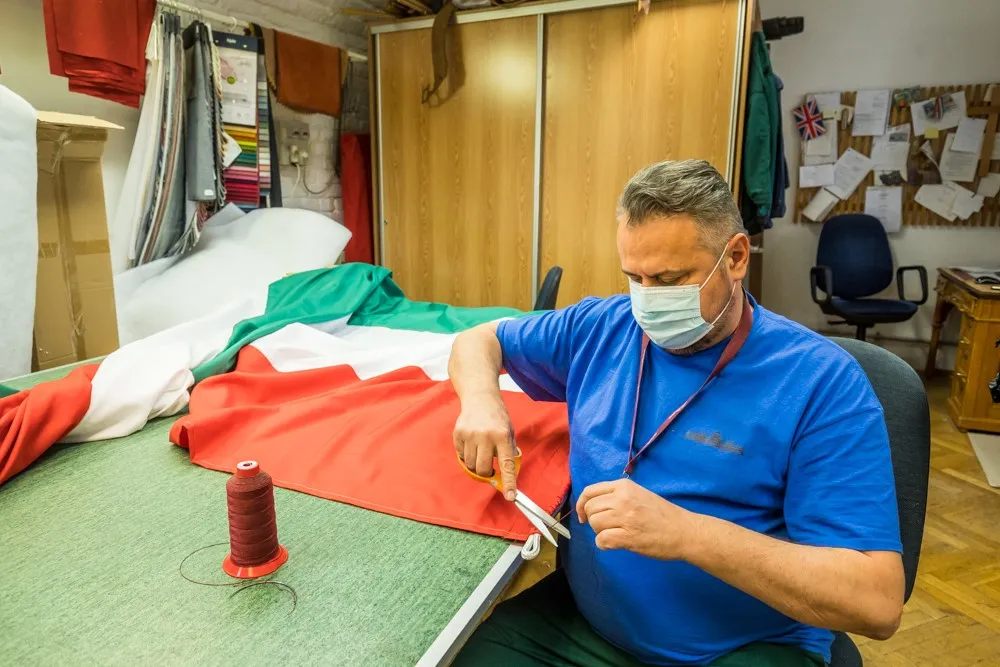 A kárpitos terembe lépve épp egy hatalmas nemzeti lobogó fölé hajolva ült az egyik kárpitos mester. A zászlók javítása napi szintű feladat. Ők varrják a zászlókat a tetőre és a homlokzatra, és amíg a méret engedi, javítják is. Mellette a kollégája bőrt cserélt egy ülésen. A bőrök folyamatosan szakadnak, szakadtan pedig nem lehetnek az ülésteremben. Ez ugyan bőrdíszműves feladat, de ezt is megtanulták az évek során. Az ajtó előtt kanapék sorakoznak, megfelelő színű huzatra várva. Mivel minden részletre figyelnek, ezeknek is olyan színűeknek kell majd lenniük, mint a házban található többi 700-nak.