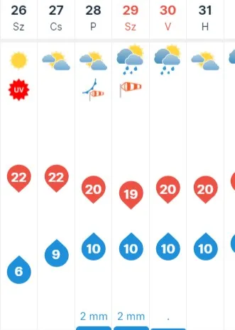 Péntekre virradóan hidegfront érkezik felerősödő északnyugati széllel. Éjszaka, hajnalban többfelé, majd napközben többségében a Dunától keletre számíthatunk záporokra, zivatarokra. Délután 17-22 fok valószínű.