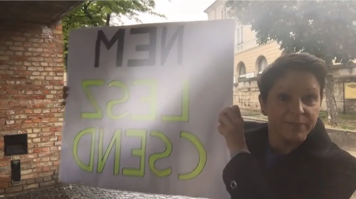 Egy személyben tüntetett a kormány ellen a Karmelita kolostornál Szél Bernadett, ám amint magasba emelte a tábláját, üzenete – a képet tükröző szelfikamera miatt – egyből a visszájára fordult.